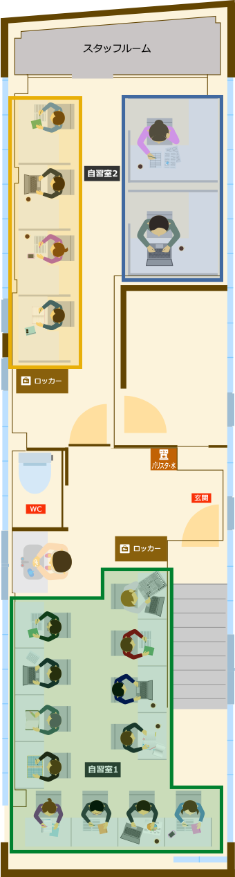 空いているお好きなお席をご利用頂けます。まるでカフェのような感覚でコーヒー等を飲みながら勉強や読書に取り組めます。リラックスして頂けるよう窓際のお席もございます。各席にコンセントを完備しています。